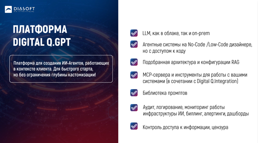 На мероприятии была представлена Digital Q.GPT – передовая ИИ-платформа для простых настраиваемых агентов и разработки комплексных мультиагентных систем, поддержка мониторинга и аудита ИИ, любых on-prem и cloud LLM. С помощью платформы Digital Q.GPT «Диасофт» управляет ИИ, который встроен на всех этапах производства ПО в компании.