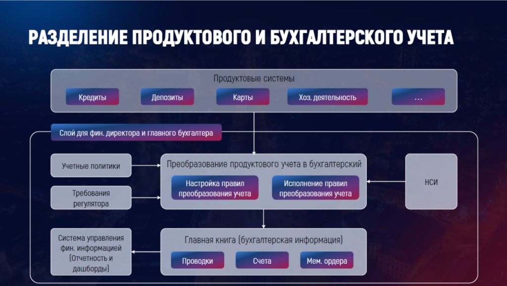 Построение единой учетной системы для преобразования продуктовых данных в бухгалтерские и формирование необходимой отчетности.